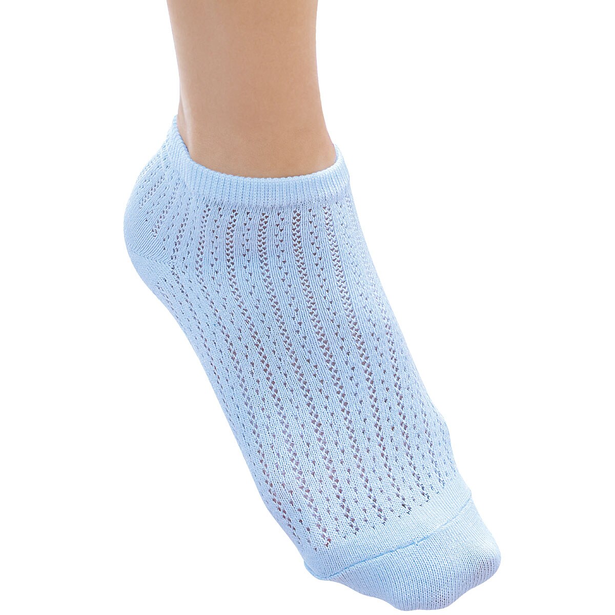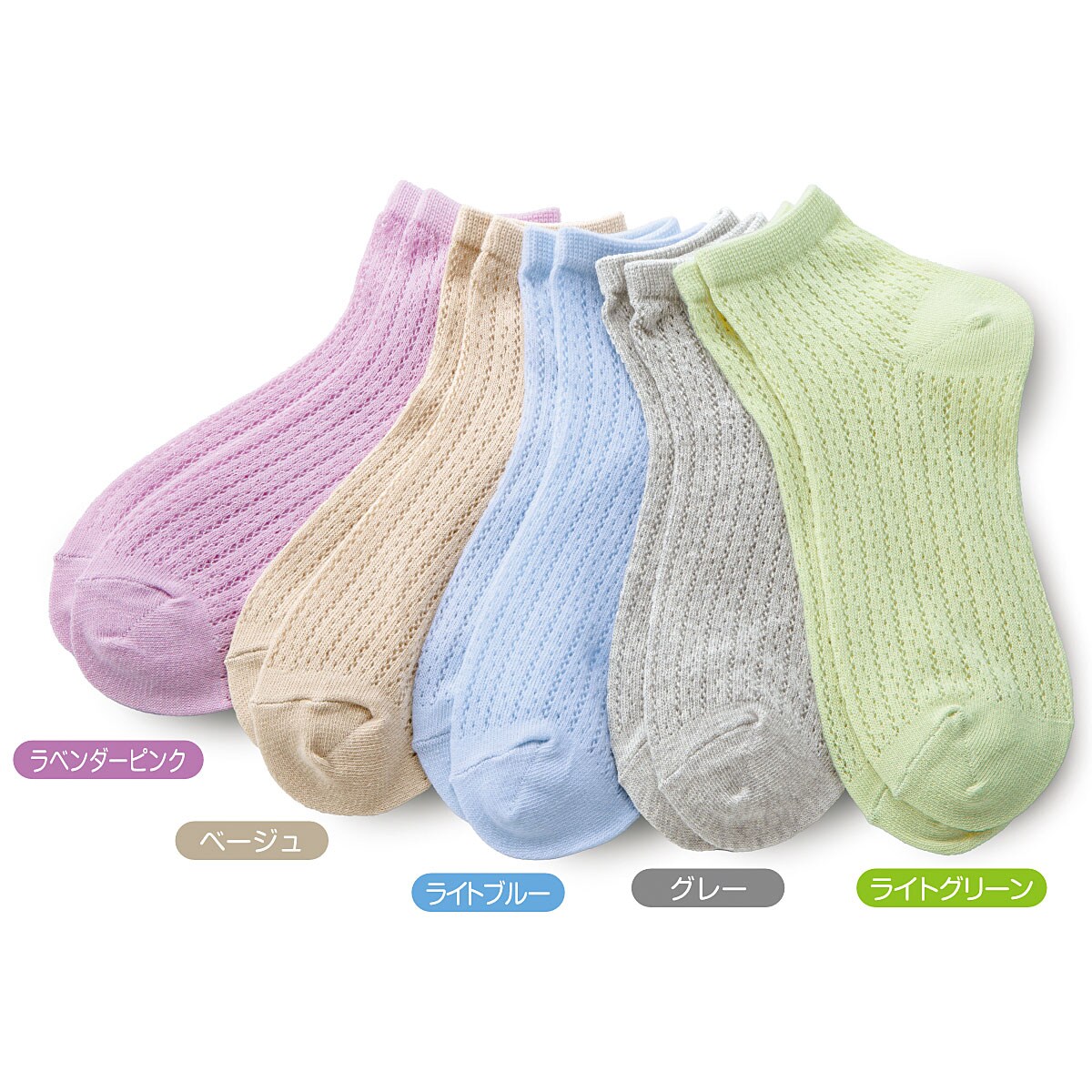 さわやかなパステル調の5色組!ズレにくく、脱げにくいリブ編みの綿混靴下。風通しが良くムレにくく、透かし編みで暑い季節も快適な履き心地。1足あたり約392円(税込)。[セット内容]ラベンダーピンク×1ベージュ×1ライトブルー×1グレー×1ライトグリーン×1