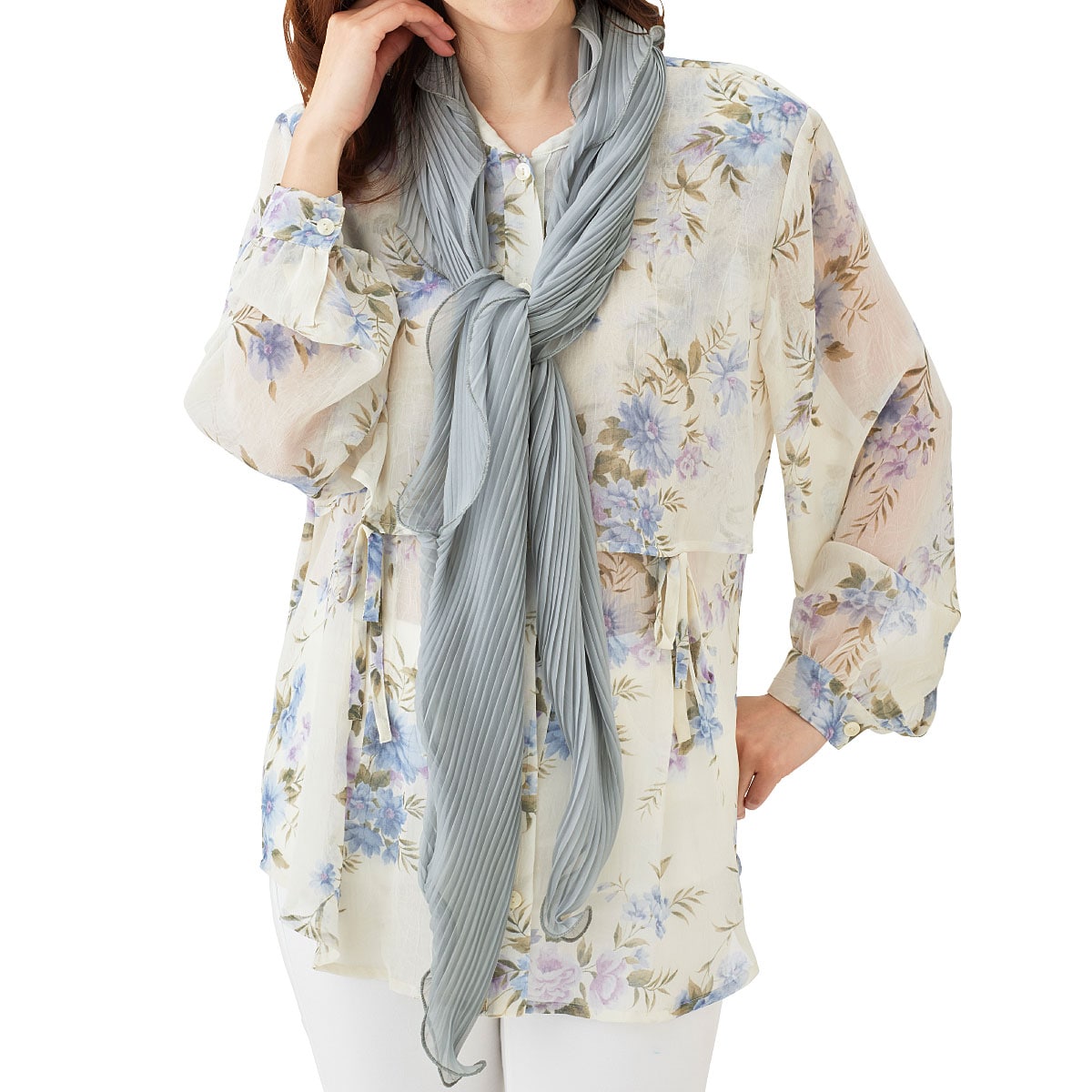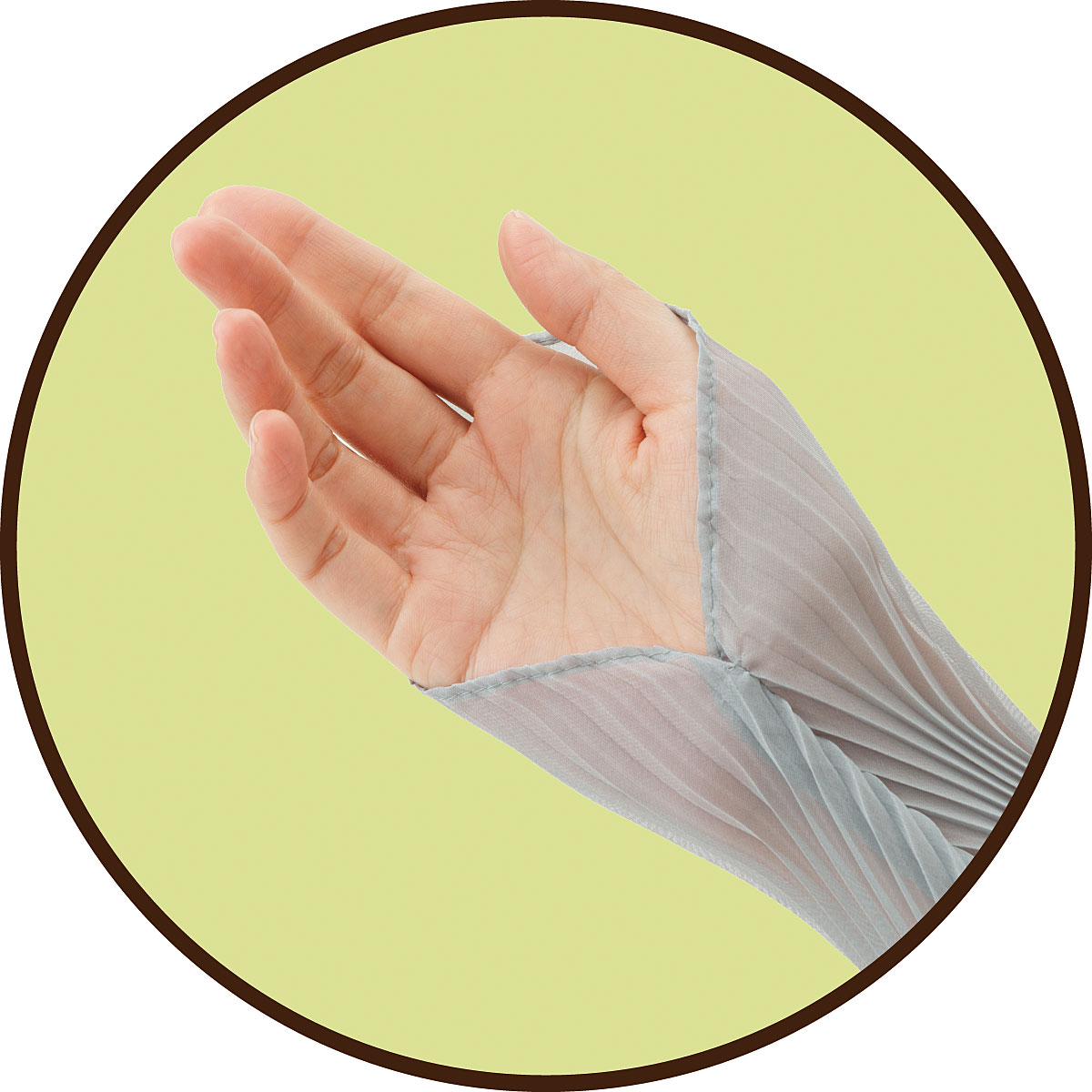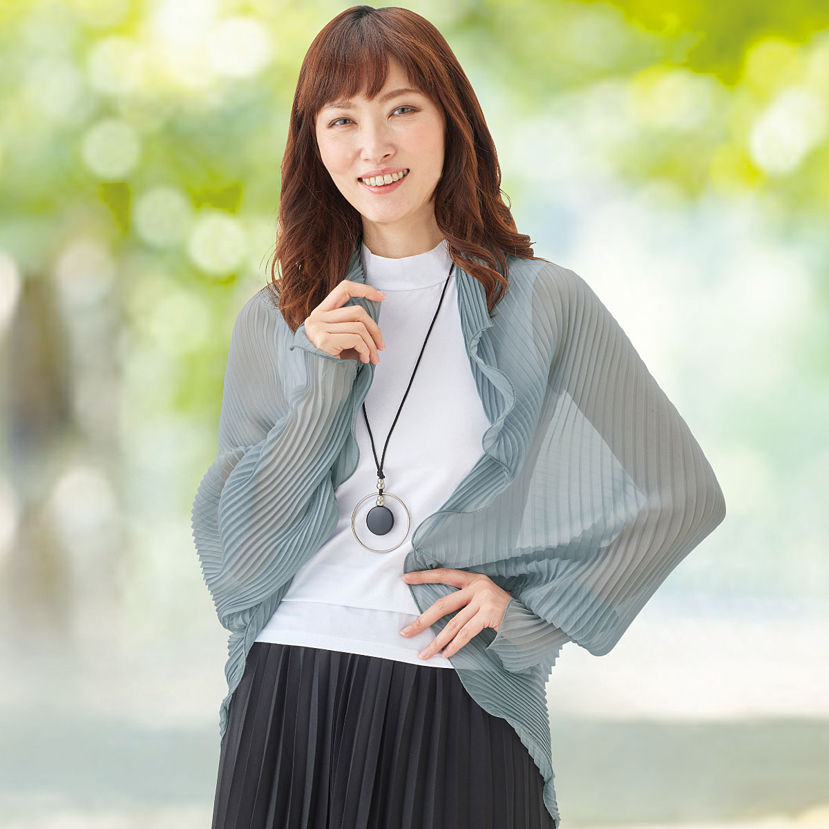 二の腕や腰まわり、お尻、背中など気になる部分をカバー!持ち運び便利で、体型隠しだけでなく冷房対策にもおすすめ。ーデザインーお尻まで隠れるロング丈。メロウフリルが上品さを演出し、伸びの良いプリーツ加工で体に程よくフィットします。