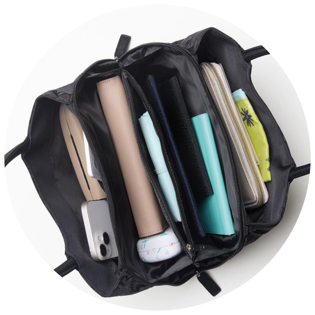 ■素材/ポリエステル■サイズ(約cm)/縦21×横29×マチ10 持ち手高さ約13cm■重量/約290g■仕様/[開閉]三層式 [内側]ファスナーポケット×1、オープンポケット×2、中仕切りファスナーポケット×1▼商品によって柄の位置や出方が多少異なります●中国製(生地:日本製)