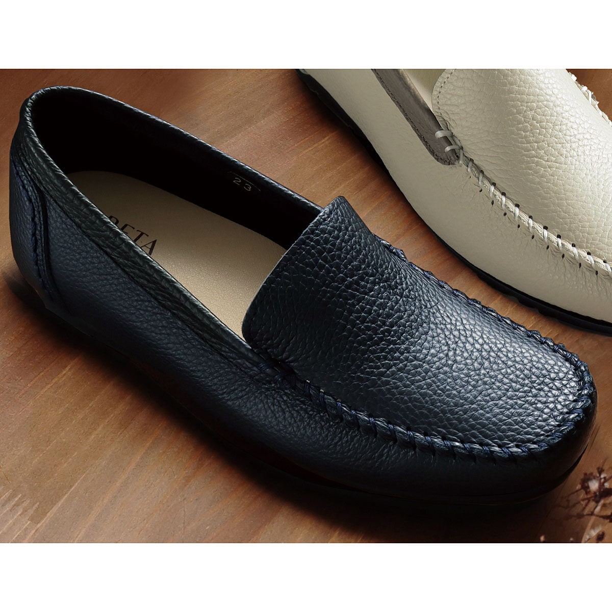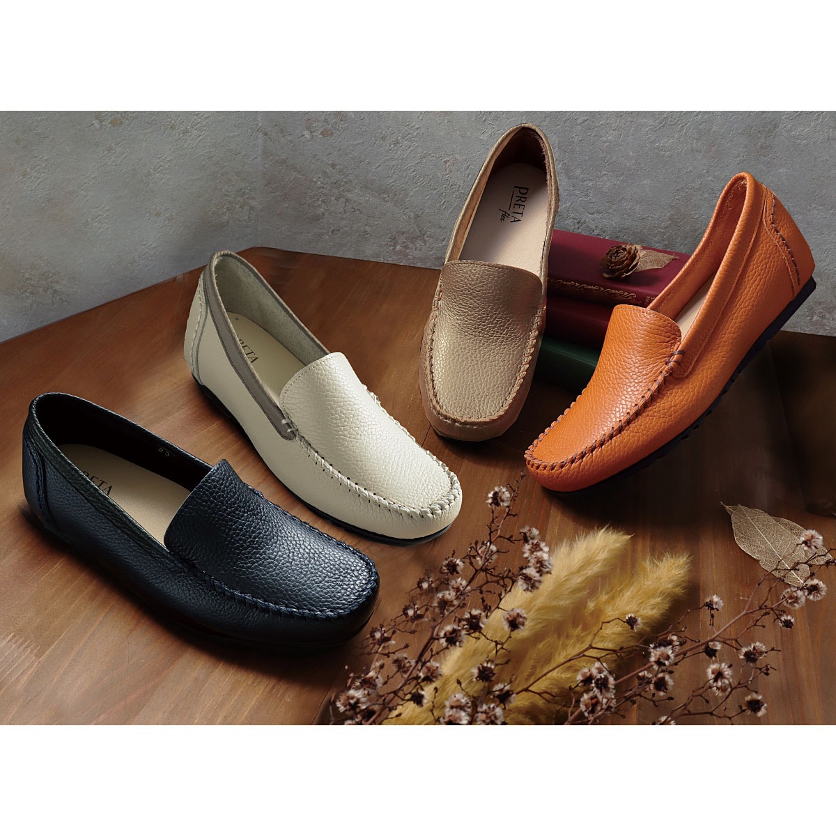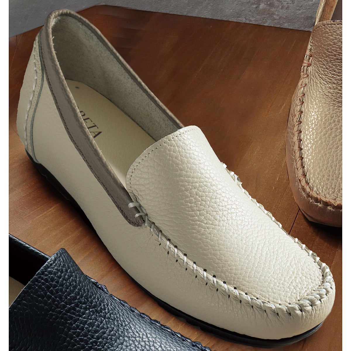 ーデザインー甲部分は手縫いのステッチが美しい曲線を描き、シンプルなアクセントに。美しいフォルムが肌にピッタリと馴染みます。【PRETAflex】永遠のお気に入りプレタフレックス。「長時間履いてもラク」軽さ・しなやかさ・クッション性履きやすさを追求した神戸発のモカシンブランドです。~重心の安定感で姿勢もサポート~桜美林大学 名誉教授 阿久根英昭氏が検証!株式会社成和が独自開発したモカシン靴のインヒール化・ミシン式靴底接合化・軽量化を評価。一度履いたらわかるPRETAflexのこだわり。優れたクッション性で、履き心地だけでなく安定感も追求しています。重心が靴底に分散されることで、姿勢補助にもなるバランスの良さ。足裏に感じる安定感は履いてすぐにわかるほどです。歩行する際にも足が前に出しやすくなり、街歩きにもショッピングでもラク。インソール、牛革、職人による手縫い…細部までのこだわりにより、「歩きやすくラク」を実現しました。国産にこだわった、成和のモカシンシューズ、ふだん使いでもどこでも場所を選ばない自信作です。季節やお洋服に合わせて、様々なシーンで美しくお楽しみください。■素材/[甲材]牛革(イタリアンレザー)[中敷]ポリウレタン[インソール]EVA[底材]軽量発泡合成ゴム■ヒール高/約1.3cm■インヒール/約1.5cm■重量/約180g(23.0cm片足)■ワイズ/3E相当※天然皮革のため、若干のシワおよび色落ちが見られることがあります。※強い摩擦や湿った状態で使用すると、色落ちすることがあります。※少し小さめの作りのため、普段お履きのサイズよりも1つ上のサイズをお選びいただくことをおすすめ致します。●日本製※靴の試し履きは必ず室内でお願いします。一度ご使用になられた靴の交換、返品はご遠慮ください。※雨の日や濡れた路面でのご使用の場合にはスリップや転倒の危険がありますので、歩行の際には十分ご注意ください。