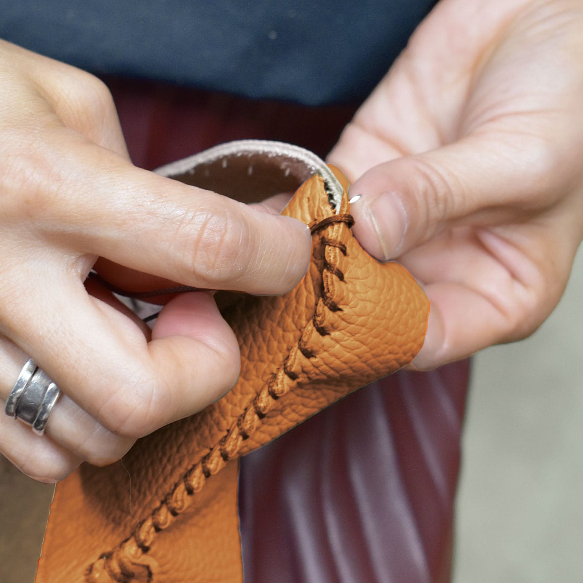 甲の部分は職人がひとつひとつ手縫いで、イタリアンレザーを丁寧に編み上げます。