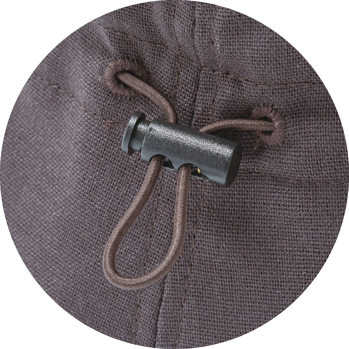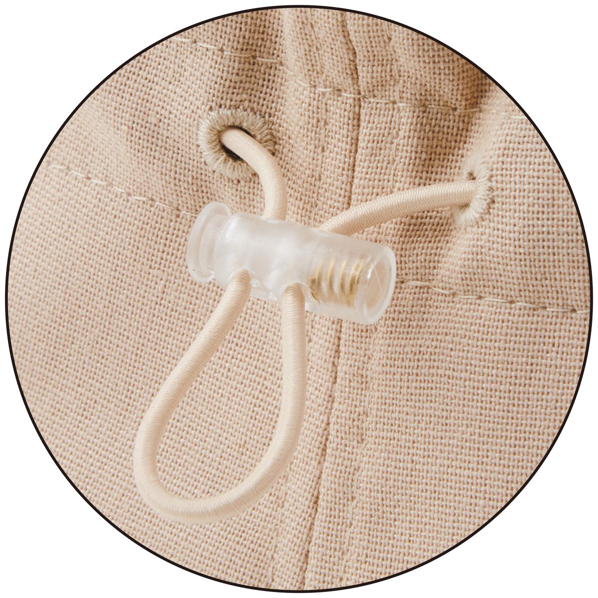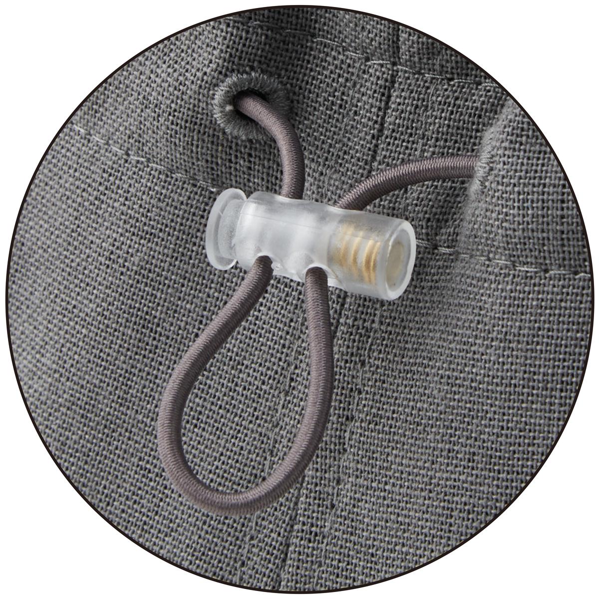フックで取り外せるあご紐と、着用後でもサイズを調節できるゴムスピンドル付き。
