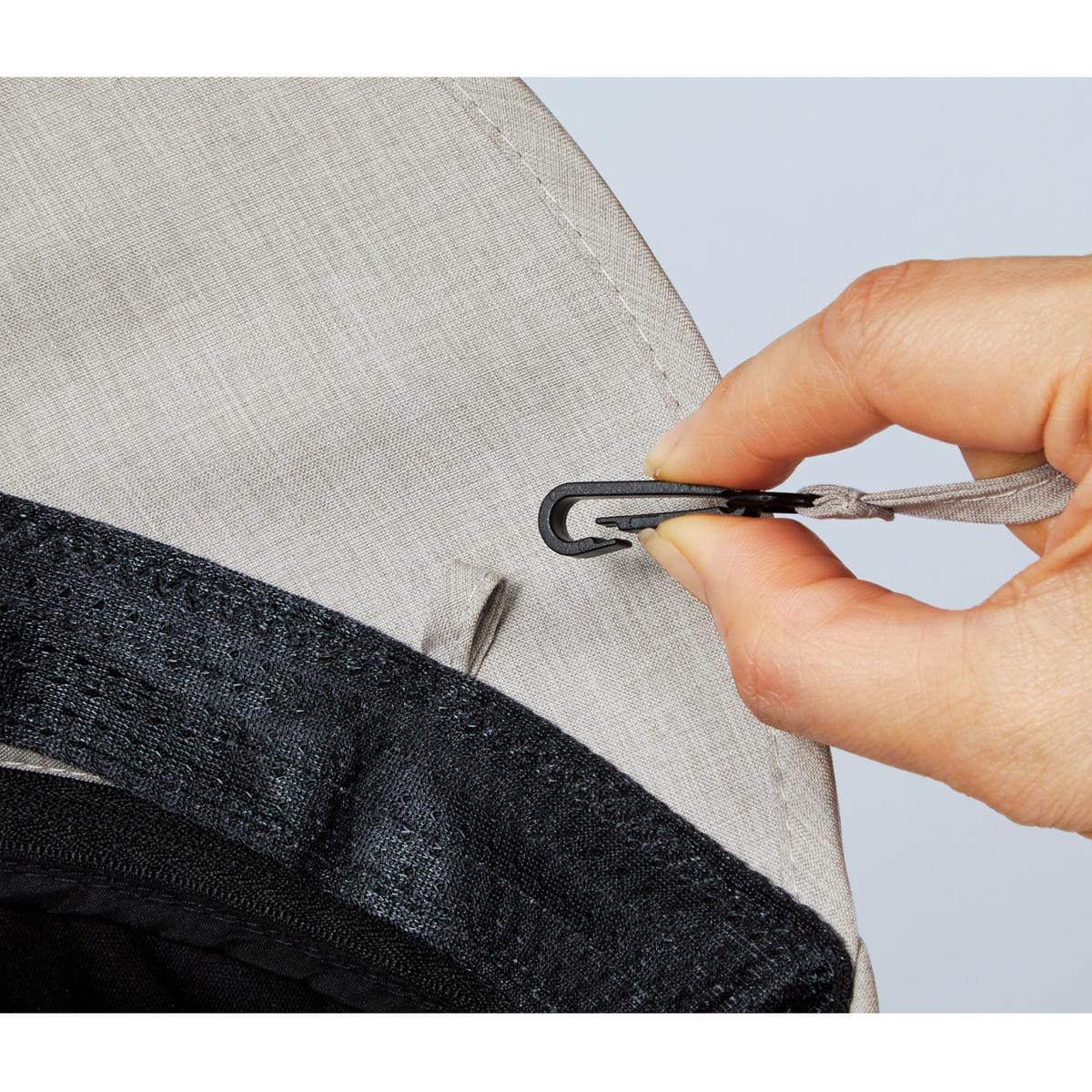 3.取り外し可能なあごヒモ付きフックで取り外しOK!