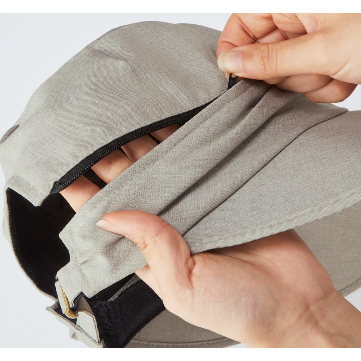 4.帽子上部はファスナー付きで取り外し可能。帽子にもサンバイザーにも
