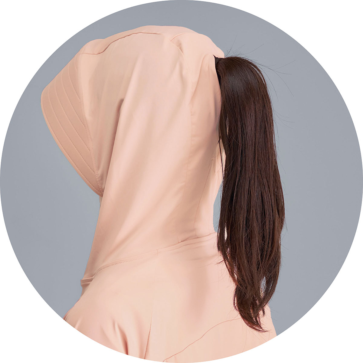 ピンク 大きなツバと口元まで上がるフロントジッパーで、顔周りをしっかりカバー。