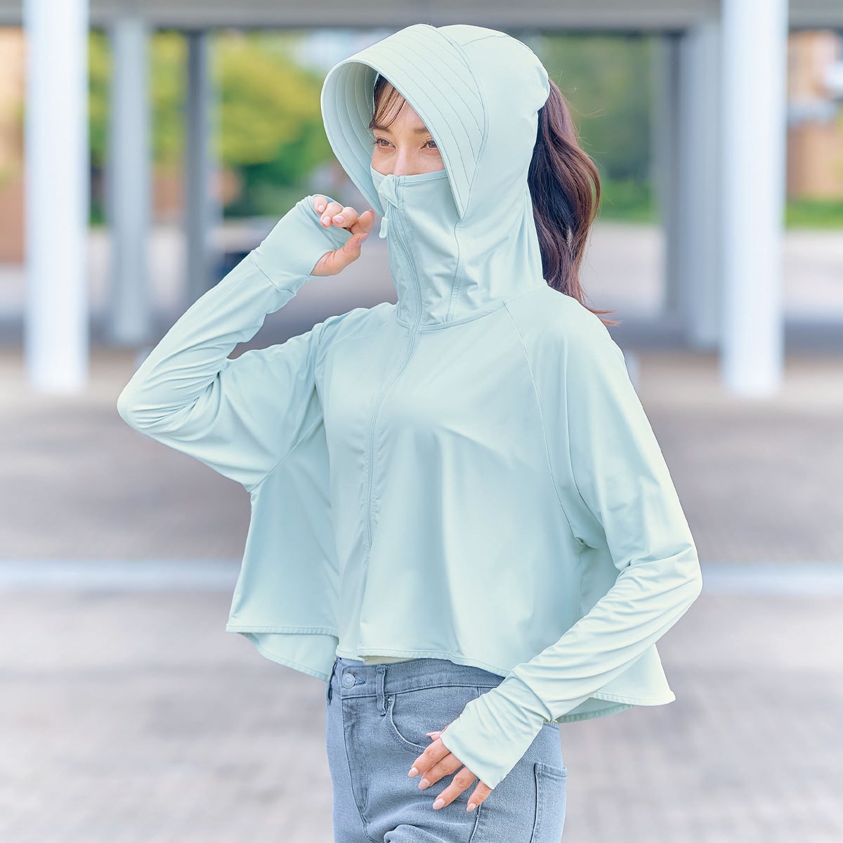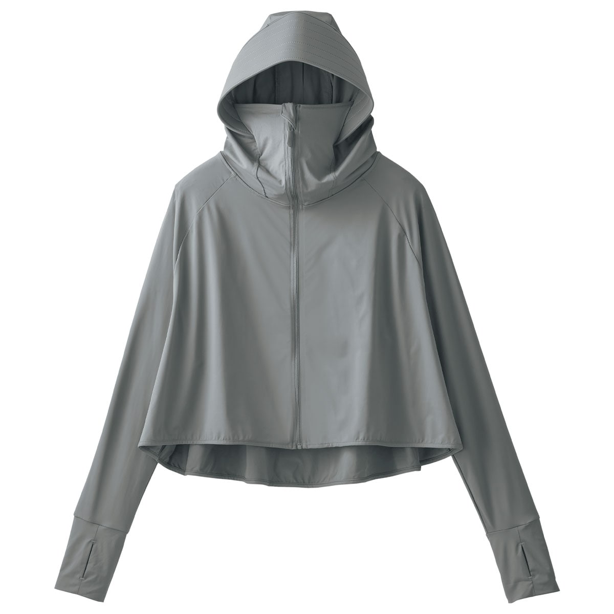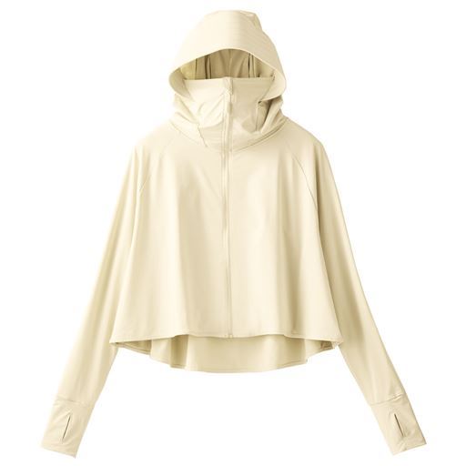 これで差がつく!夏の快適度!夏にうれしい機能を盛り込んだパーカー。サラッとはおって買い物やウォーキングに。ーデザインー大きなツバと口元まで覆うフロントジッパーで、顔周りをしっかりカバー。日射しをガードする芯入りつば。親指が出せる指穴付きで甲までカバーし、ボレロ風の短い丈で風を通しやすい。ひも付きのジッパーで上げ下げしやすい。フードには、髪を通せる穴付き。ー素材特性ー口元はメッシュ素材を使用。