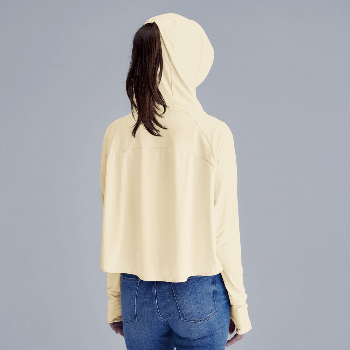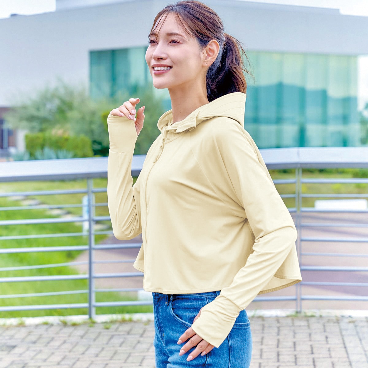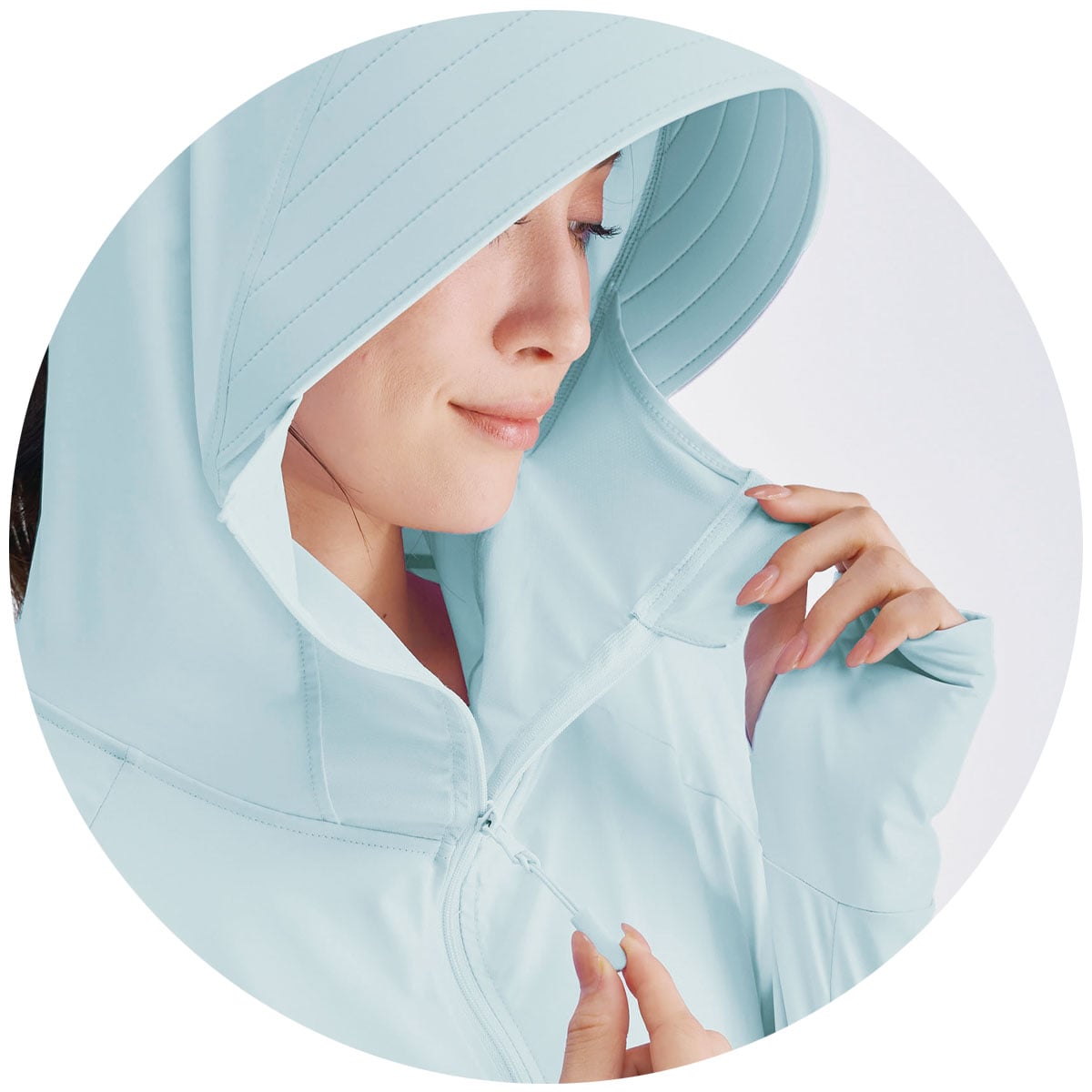 これで差がつく!夏の快適度!夏にうれしい機能を盛り込んだパーカー。サラッとはおって買い物やウォーキングに。ーデザインー大きなツバと口元まで覆うフロントジッパーで、顔周りをしっかりカバー。日射しをガードする芯入りつば。親指が出せる指穴付きで甲までカバーし、ボレロ風の短い丈で風を通しやすい。ひも付きのジッパーで上げ下げしやすい。フードには、髪を通せる穴付き。ー素材特性ー口元はメッシュ素材を使用。