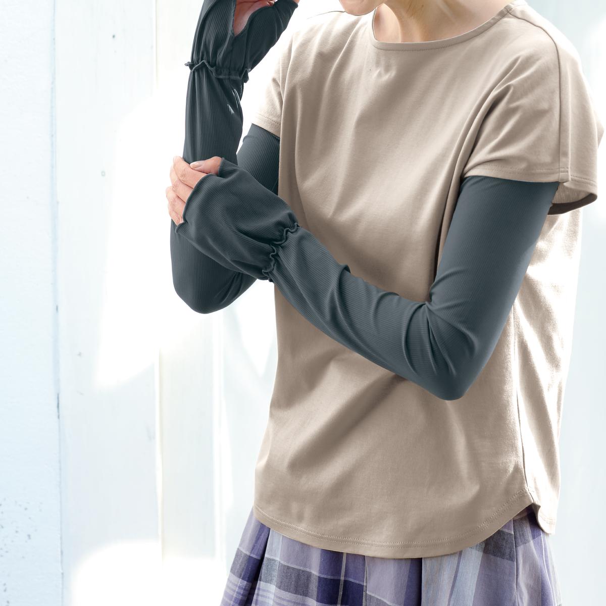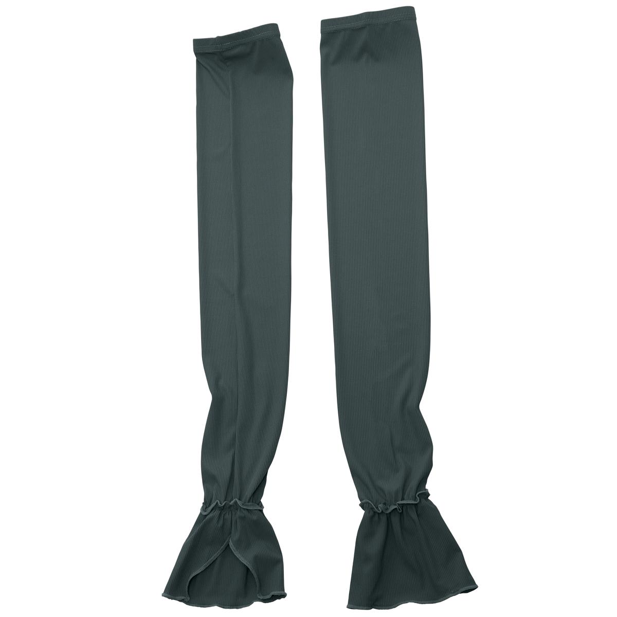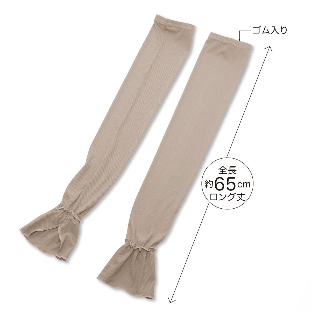 全長約65cmロング丈。上部はゴムでフィットしてズレにくい。指穴に親指と小指を通し、手の甲までしっかりカバーできます。ーデザインー袖口フリルのフェミニンなデザインで、重ね着をしているように見えるのもポイント!ー素材特性ーCOOL接触冷感加工。【UVカット率約97%】ダークグレー【UVカット率約99%】A(モカグレー)