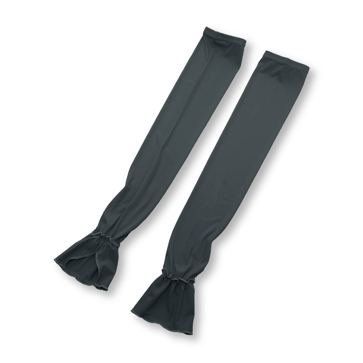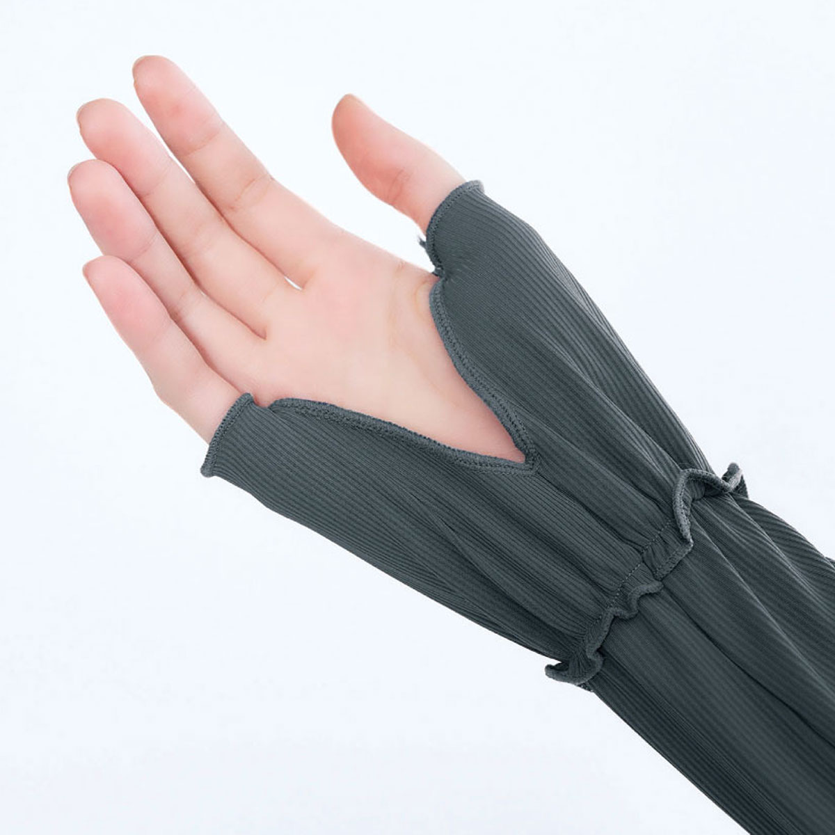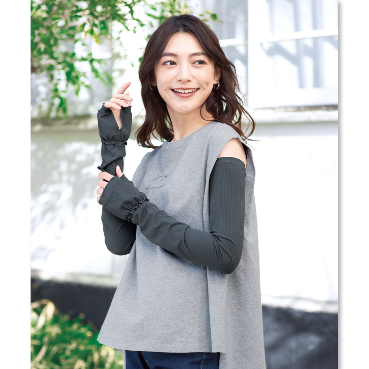 全長約65cmロング丈。上部はゴムでフィットしてズレにくい。指穴に親指と小指を通し、手の甲までしっかりカバーできます。ーデザインー袖口フリルのフェミニンなデザインで、重ね着をしているように見えるのもポイント!ー素材特性ーCOOL接触冷感加工。【UVカット率約97%】ダークグレー【UVカット率約99%】A(モカグレー)