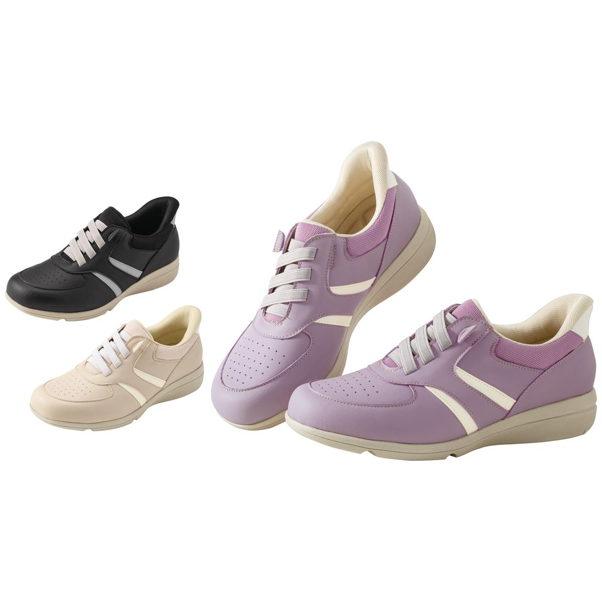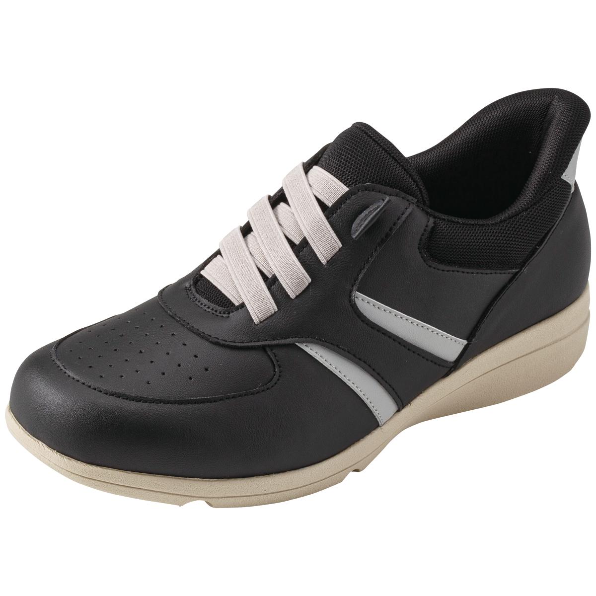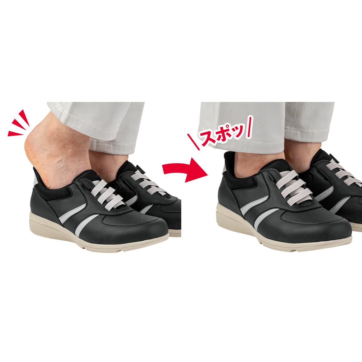 かがむのがつらい人にもおすすめ!手を使わずスポッとはける!かかと部分が靴ベラのような形状なので、立ったままスムーズにはけます。ーこだわりPOINTー・脱ぎはきがラクな甲ゴム…脱ぎはきスムーズ&足の動きにフィット。・立ったまま手を使わずはける…靴ベラのようなかかと形状で立ったままスムーズに足入れできます。・かかとの衝撃を緩和…かかと部分にクッションを2重に配置し、衝撃を緩和。・甲ゴム仕様でほどけない。