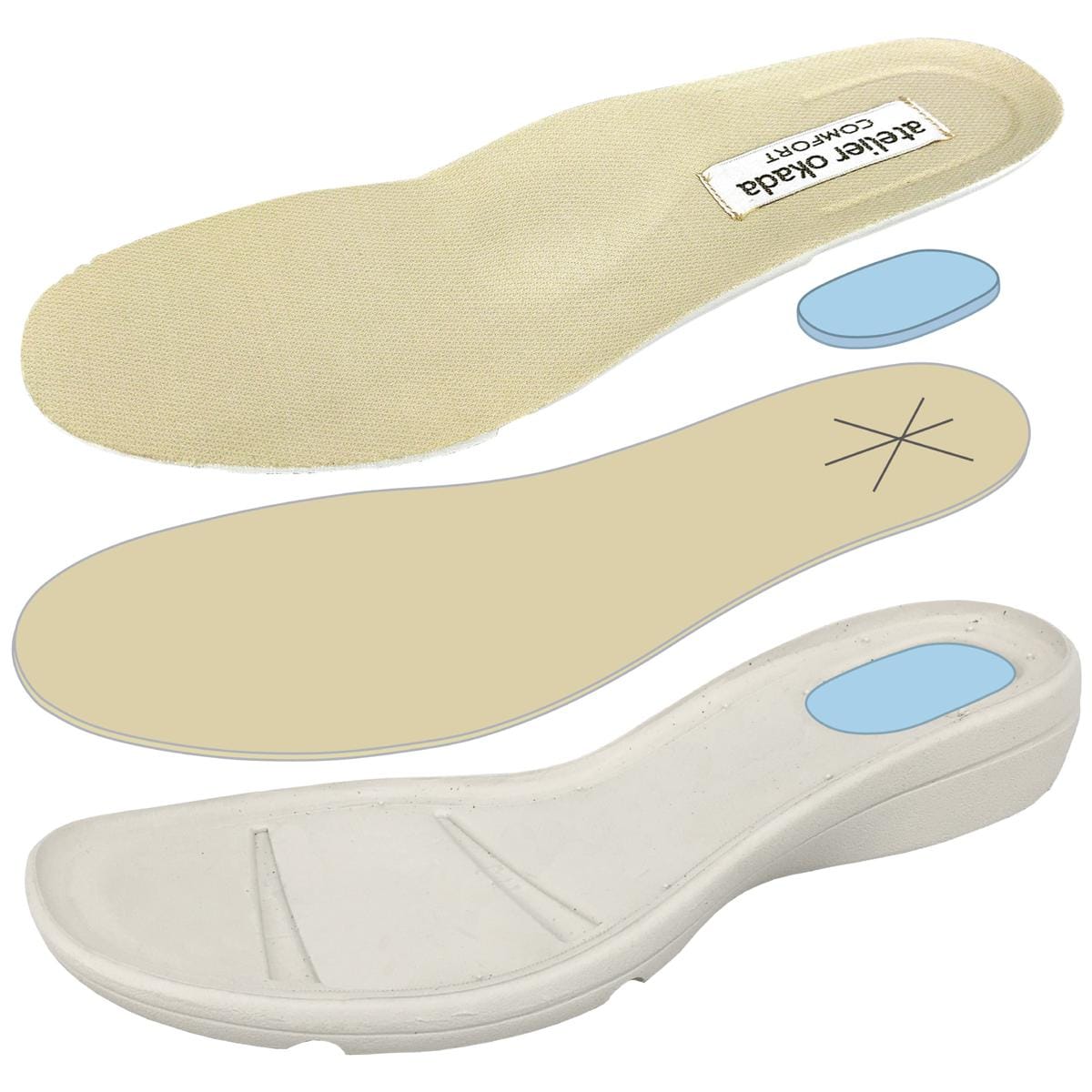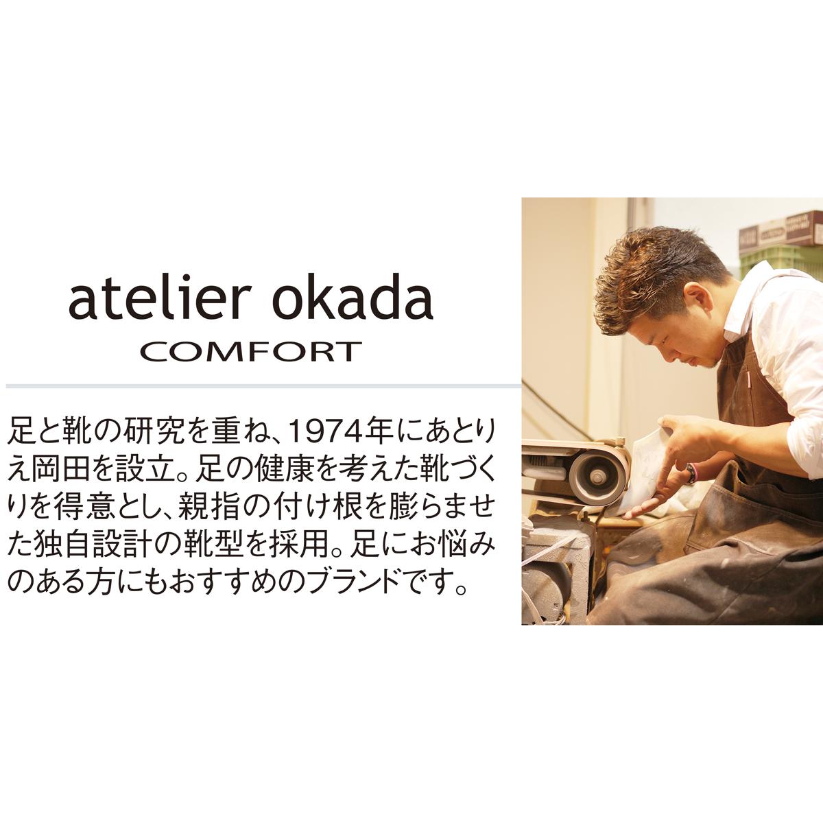 ~あとりえOKADA~足と靴の研究を重ね、1974年に設立。足の健康を考えた靴づくりを得意とし、親指の付け根を膨らませた独自設計の靴型を採用。足にお悩みのある方にもおすすめのブランドです。【軽量約190g(Mサイズ片足)】■素材/[甲材]合成皮革、ポリエステル [底材]合成底 ■ヒール高/約3.5cm ■重量/約190g(Mサイズ片足) ■ワイズ/5E相当●中国製※靴の試し履きは必ず室内でお願いします。一度ご使用になられた靴の交換、返品は承れません。※雨の日や水に濡れた路面・床面でご使用の場合には、スリップや転倒の危険がありますので、歩行の際には十分ご注意ください。