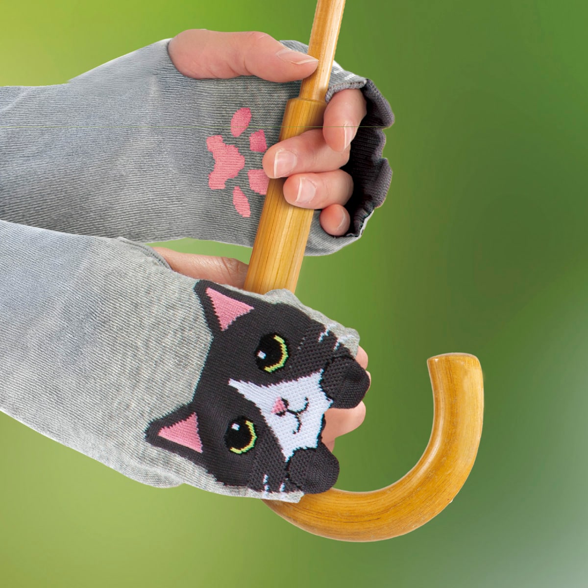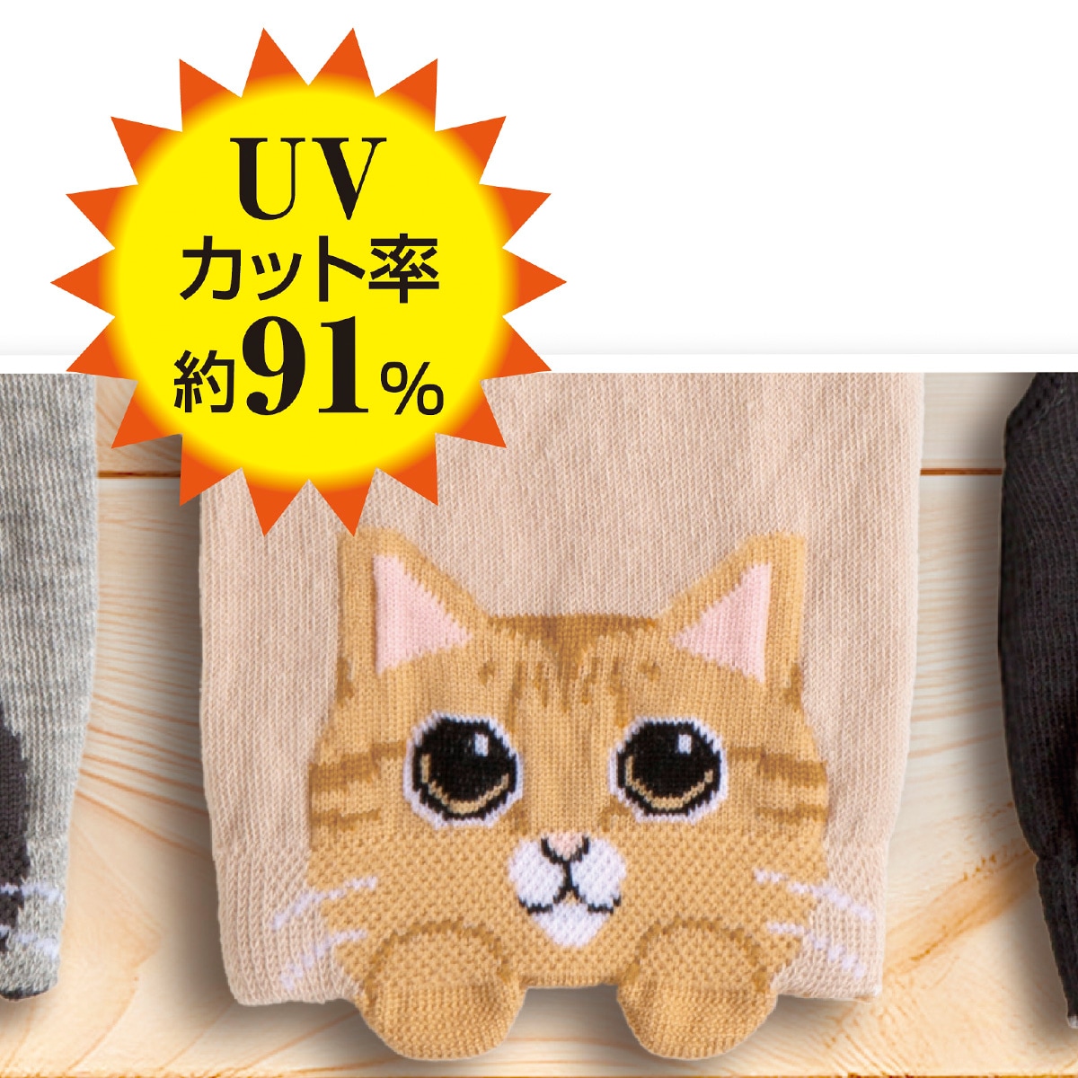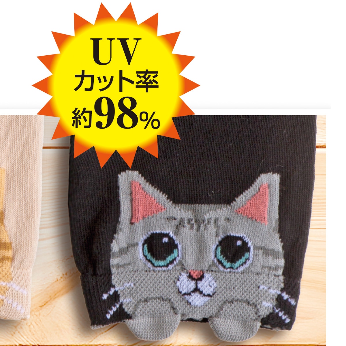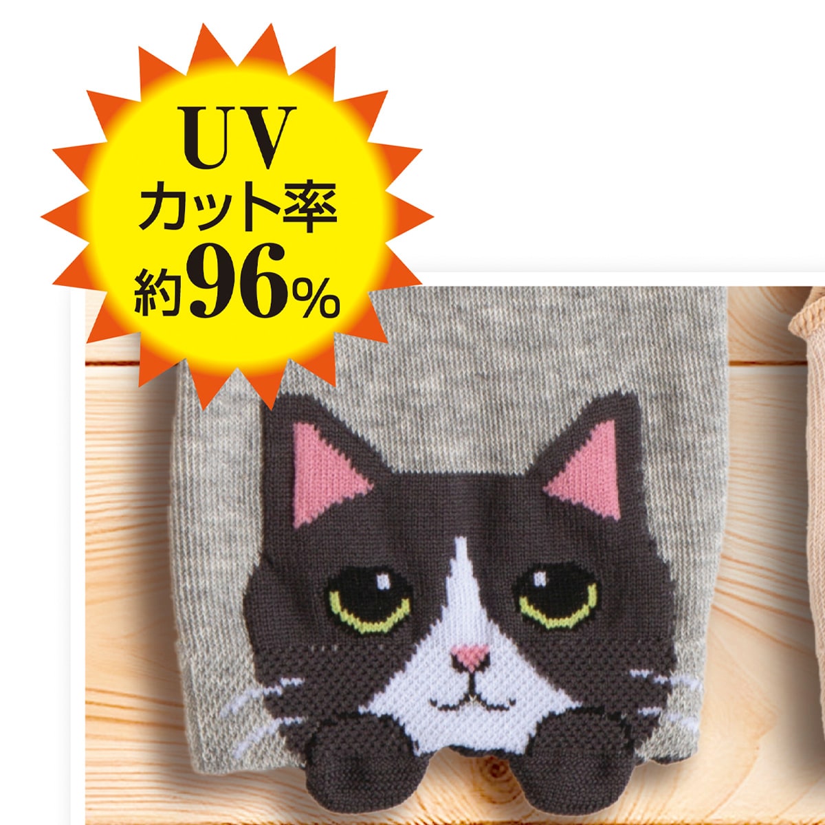 ニャンコが手元から顔を出しているように見える可愛いアームカバーで紫外線対策!二の腕までカバーできるロングタイプで、締め付けないゆったりゴム口。-デザイン-手のひら側には可愛い肉球デザイン。指先があいているのでスマホ操作も可能![UVカット率]A(ハチワレ):約96%B(茶トラ):約91%C(アメショ):約98%