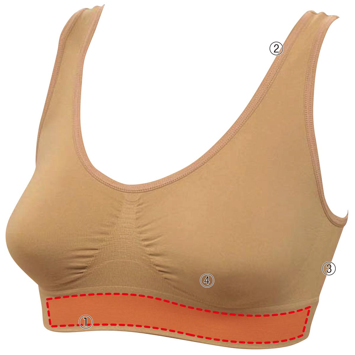 編み立て強度アップ サイドとフロントの編みたて強度をUP。就寝時の上~横流れを抑え、ホールド感を上げ、丸みのあるバストをメイク。