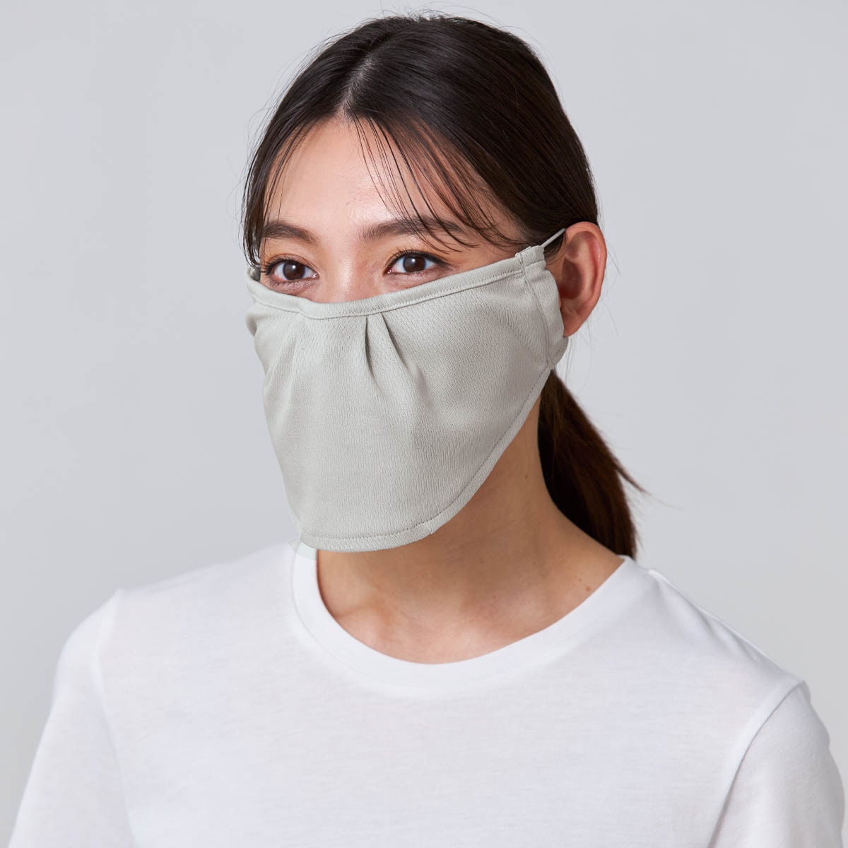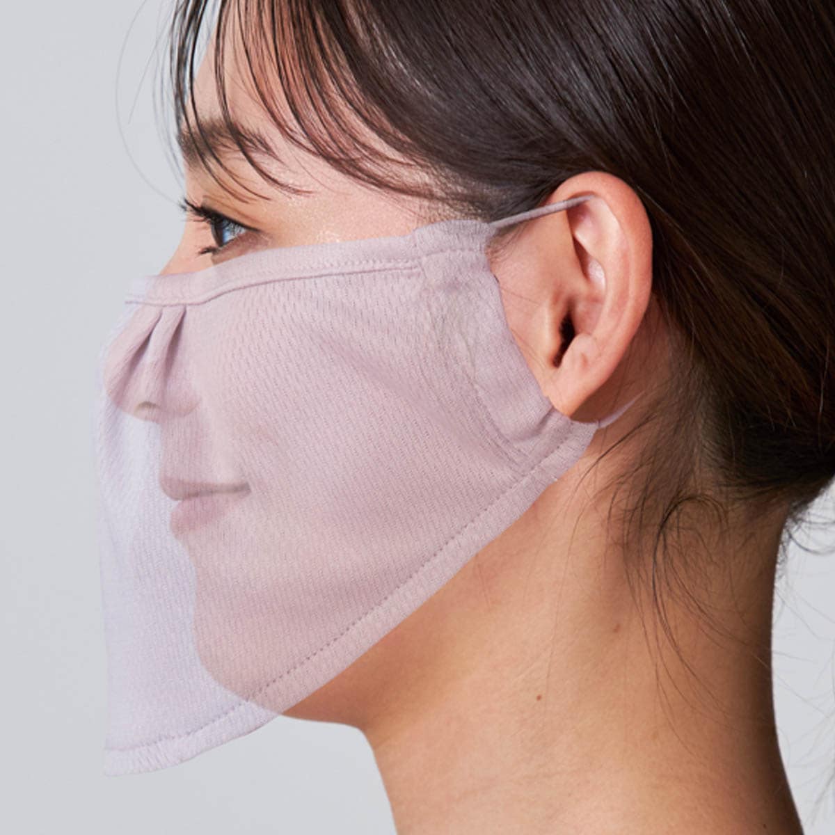 シミができやすい頬骨まわりや目の下もカバー 上部に入れたワイヤーがずり落ちを抑えます 息苦しくなく、ムレにくい下が開いているので息が通りムレにい。化粧が崩れにくいのも嬉しいポイント※イメージ
