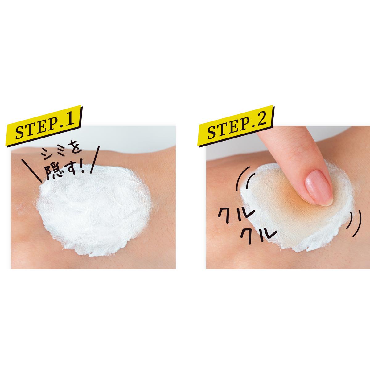 白いクリームがシミ・くすみ等をカバー(※)し、なじませることで新鮮な肌色に発色。自然でツヤ感のある美しい肌に。※メーキャップ効果による