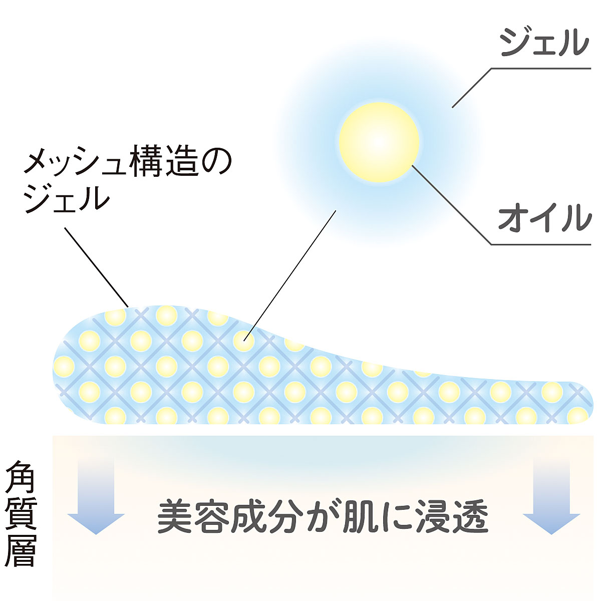 メッシュ構造のジェルがオイルとともにうるおい膜を形成。肌表面を包み込んで逃さず、しっとり感をキープします。