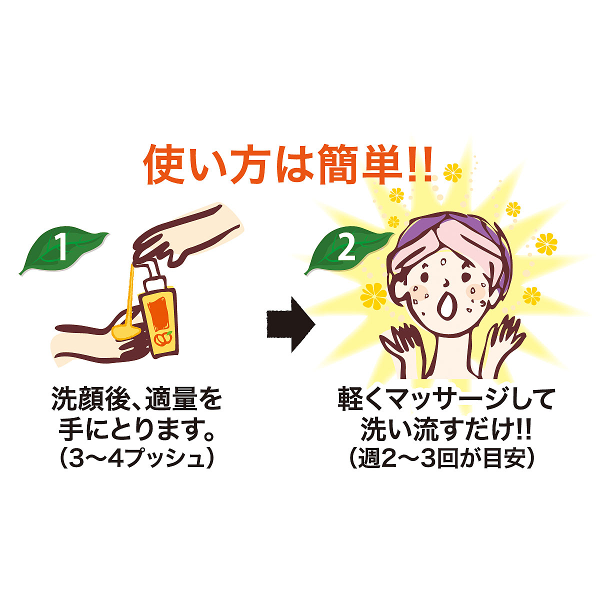 ~使い方は簡単~1.洗顔後、適量を手に取ります。(3~4プッシュ)2.軽くマッサージして洗い流すだけ※A アスコルビルリン酸Na(保湿成分) ※B パパイン、リパーゼ(洗浄成分)※C ユビキノン(保湿成分) ※使用後はぬるま湯で洗い流してください。■内容量/[1個あたり]150mL●日本製※商品の特性上、交換・返品はお受けできません。【全成分】水、グリセリン、オレンジ花水、ジココジモニウムクロリド、(アクリレーツ/アクリル酸アルキル(C10-30))クロスポリマー、オレンジ果皮油、ヒアルロン酸Na、アセチルヒアルロン酸Na、水溶性コラーゲン、加水分解コラーゲン、ユビキノン、スクワラン、ローヤルゼリーエキス、ローズマリー葉エキス、アスタキサンチン、パルミチン酸レチノール、アラントイン、BG、コーン油、トリ(カプリル酸/カプリン酸)グリセリル、クエン酸、ヒドロキシプロピルメチルセルロース、結晶セルロース、トコフェロール、マンニトール、イソプロパノール、ステアルトリモニウムブロミド、パパイン、デキストリン、リパーゼ、乳糖、アスコルビルリン酸Na、酸化鉄