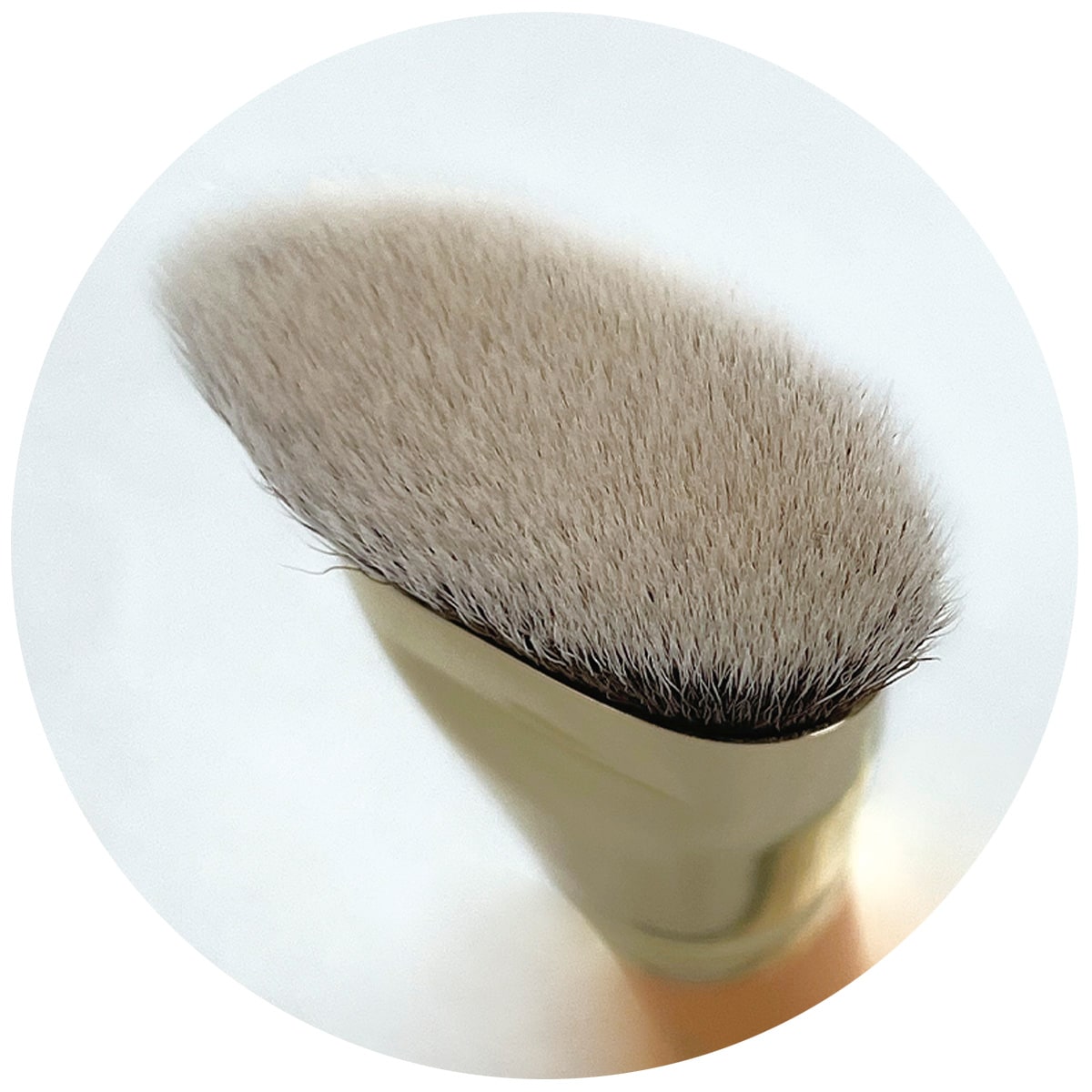 パフとブラシのW使いでより密着し、崩れにくい肌へ 【STEP1】ブラシにファンデーションを付け、直角に立てて顔の内側から外側に塗り広げる。