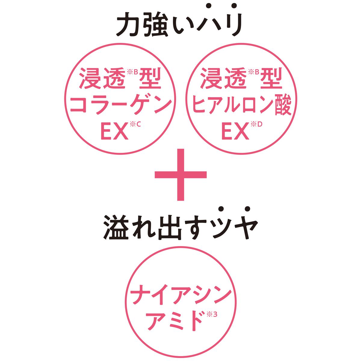 ※B 角層まで※C 浸透(※B)型コラーゲンEX=加水分解コラーゲン、アセチルヘキサペプチド-8、シイタケエキス(整肌成分)※D 浸透(※B)型ヒアルロン酸EX=アセチルヒアルロン酸Na(保湿成分)※3は整肌成分
