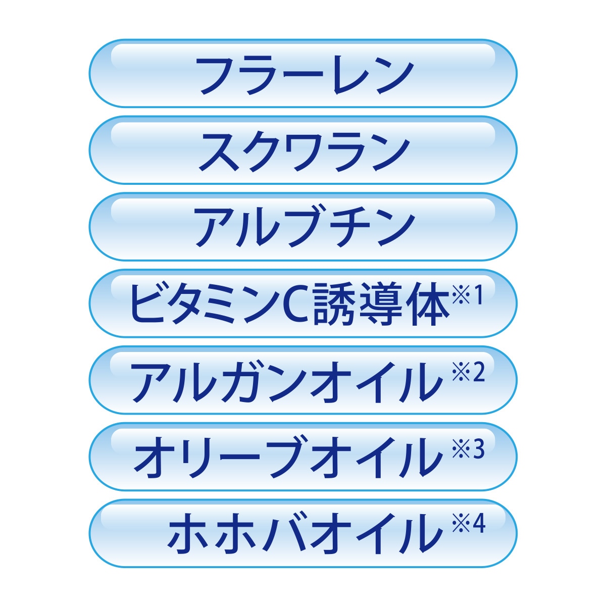 1.7種類の美容保湿成分配合…フラーレン、スクワラン、アルブチン、ビタミンC誘導体(※1)、アルガンオイル(※2)、オリーブオイル(※3)、ホホバオイル(※4)