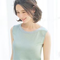 ラメ使いテープで顔まわりを華やかに。前衿ぐりに施したテープ使いがアクセントになるタンクトップ