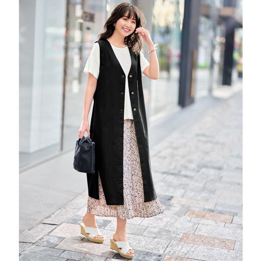 涼しげな麻混素材のジレは深めのサイドスリット入りで足さばきが良く、ボトムとも好バランス。いつものコーデにジレを羽織るだけで一気に着やせ&おしゃれ見えが期待できますよ♪