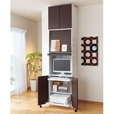 省スペースにパソコン関連商品をすべてまとめて収納できます。高さがあるので、省スペースにパソコン本体やモニター周辺機器をまとめて収納できます。開閉しやすいフラップ扉で、来客時にはサッと閉じてお部屋すっきり。
