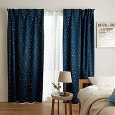 キラキラかわいい! 箔プリントで描かれた星がきらめく遮光カーテンです。1級遮光で、気になる光もしっかりカット。遮熱・保温効果もプラスしました。