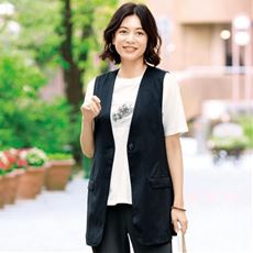 シワが目立ちにくく体型もカバー!夏にうれしい大人のはおりものトレンドのおしゃれ感が手に入るロング丈ベスト(日本製)