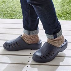 ベランダや庭先のちょい履きにおすすめ!水が穴から下に抜けるので、靴の中に溜まらずサッと乾きます。厚底ヒールで、衣服の裾が地面につきにくい仕様。
