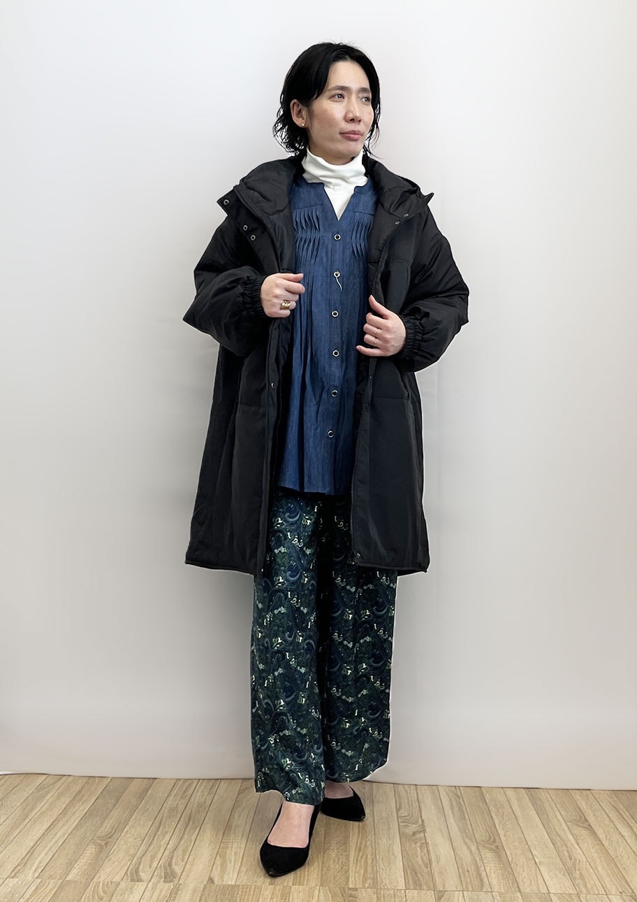 タートルインしたデニシャツ、柄パンでリラックスコーデへシフト