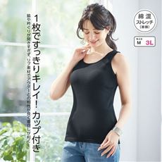 着ていることを忘れそう!後身のアンダーゴムが無く、ラクに着られる綿混素材のカップ付きタンクトップ