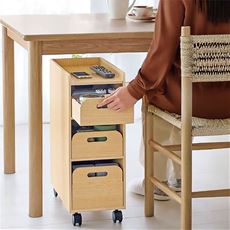 散らかりがちな小物をひとまとめに!テーブル下に入れても邪魔になりにくいスリムタイプのワゴンです。ちょい置きに便利な天板と持ち運び可能な3段のトレー付ですっきり収納できます。