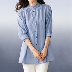 バンドカラーにフリルをあしらった、清涼感のあるストライプ柄ブラウス